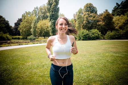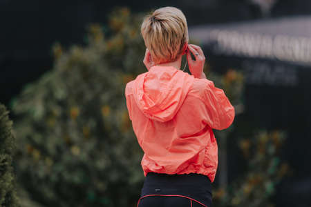Woman listening to music while running outdoors in the morning, low angle view. Space for text