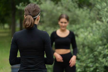 Two beautiful athletic women in sportswear with perfect body high five to each other outdoors