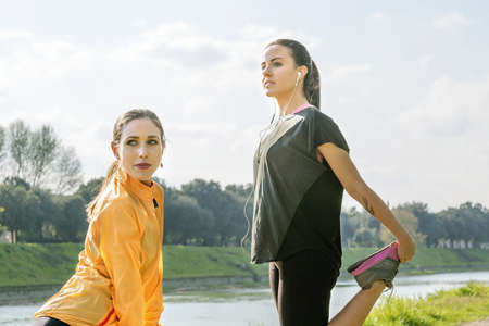Two young sporty woman standing near wall and have a rest after morning running in city