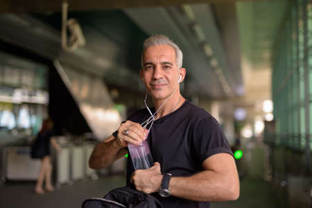 Pleased unshaven guy looking at wristwatch while working out on promenade