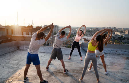 Group of cheerful fit fitness friends team exercising together outdoor. Sport people concept