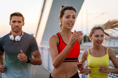 Fitness sport people running lifestyle concept. Group of young people jogging together outdoors.