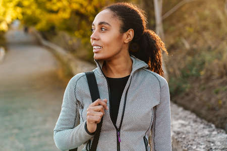 young black runner girl enjoying outdoors jogging workout - young attractive and fit African American woman running at countryside road in sport practice concept and healthy lifestyle