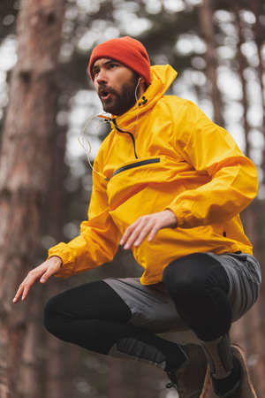 Athletic friends have a fun day hiking in the forest, enjoying nature and discussing various topics under the sunny sky.