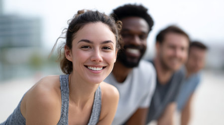 Group of smiling, multi ethnic athletes wearing vibrant sportswear, preparing for an energetic urban workout, embodying the spirit of health, fitness, and community