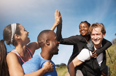 Happy people, fitness and applause with high five in nature for workout goals, winning or teamwork. Active, group or friends clapping with smile for success, exercise or health and wellness together
