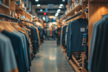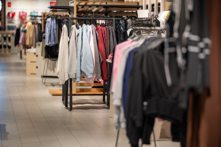 Clothing store interior with selective focus and shallow depth of field, highlighting a rack of stylish garments in a trendy boutique.