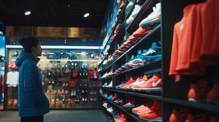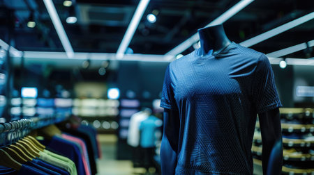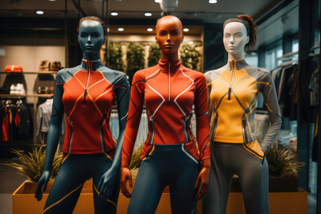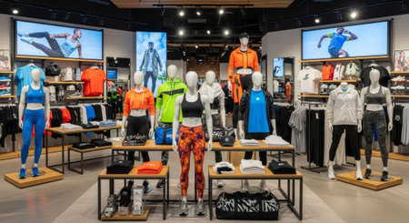A modern athletic clothing store interior features mannequins showcasing activewear and sportswear, suitable for advertising fitness campaigns and editorial publications.