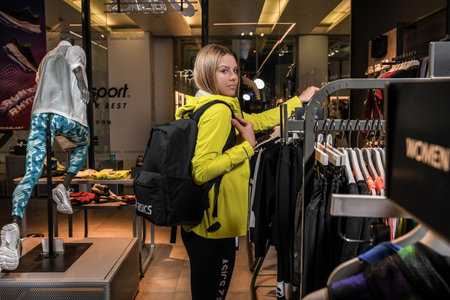 Skopje, North Macedonia - March 12, 2021: Asics store in Skopje, North Macedonia. Girl photo model wearing sports tracksuits and sneakers ASICS GEL, carrying a sports backpack on her shoulder