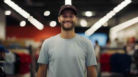 Smiling african american man is engaging with customers in a retail store, surrounded by clothing racks and a vibrant shopping atmosphere.