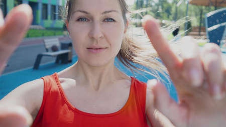 Young female athlete doing workout, coach blogger starts recording an online lesson, remote training over the Internet. A young woman pokes her finger at the screen, the record button