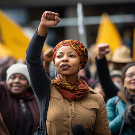 A diverse group of people with raised fists at a protest march against racism and social injustice. Concept Protest March, Social Justice, Diversity, Activism, Solidarity
