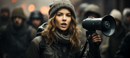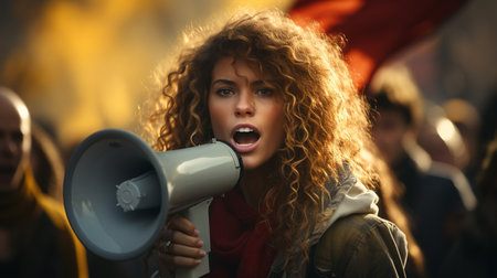 Female activist shouting megaphone for her cause among people demonstration protester. Generative AI