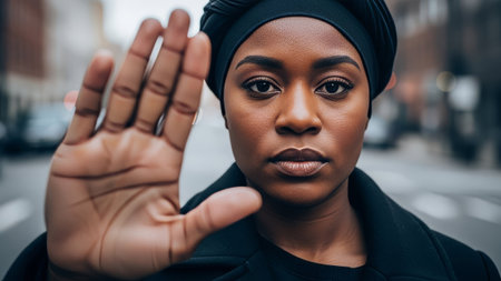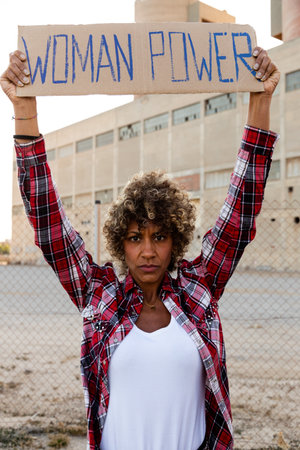 Confident African american demonstration protester looking at camera holding a woman power sign above her head.