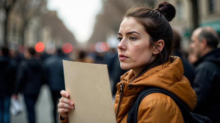 White female activist joins a demonstration, holding a blank sign in a crowded city street. Her determined expression shows her commitment to change