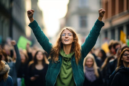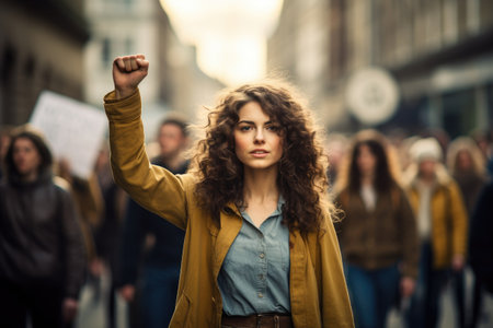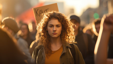 Confident young woman with curly red hair leads passionate protest rally, raising fist while speaking to diverse crowd in dramatic lighting