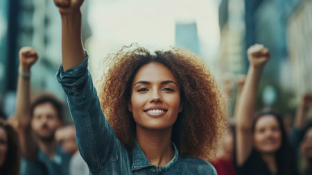 A determined young woman with curly hair smiles and raises her fist in solidarity at a social justice rally