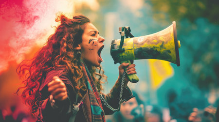 Young activist in a protest, shouting in a megaphone. Demonstration