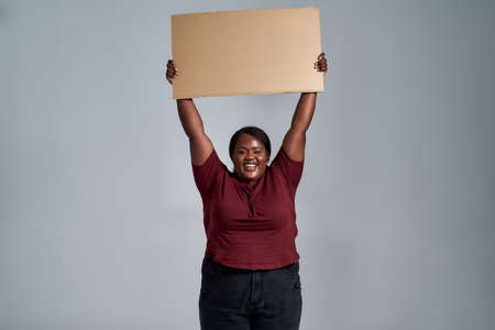 Cheerful plus size young african american woman in casual clothes smiling at camera, holding blank cardboard banner above her head, posing isolated over gray background
