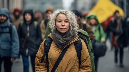 Peaceful Demonstration on the streets of the city, young adult people, protesting or riot, women crowds of people in a tight crowd, Ai generated