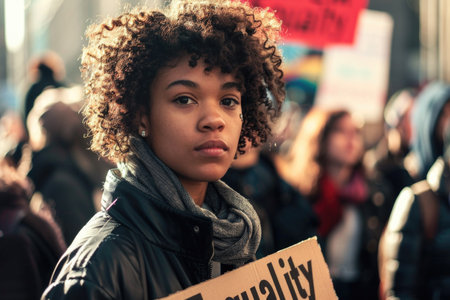 A young woman with curly hair holds a sign that reads equality at a protest. She looks directly at the camera with a determined expression.
