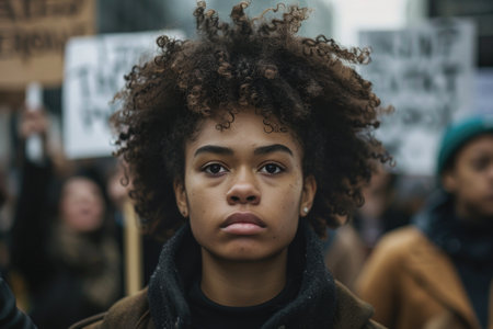 A young woman with curly hair stands amidst a crowd of protesters, her determined gaze focused on the camera.