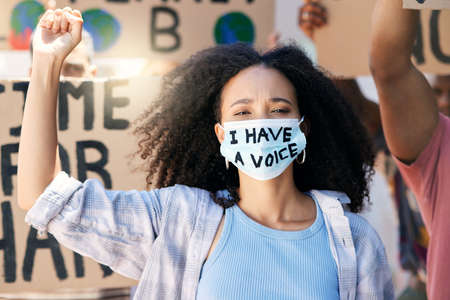 Protest and demonstrations. rebellious woman with face mask striking . High quality photo