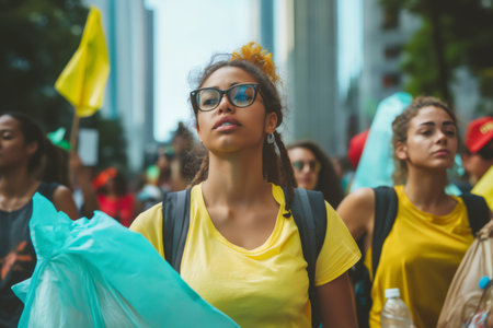 Young activists marching for environmental conservation, carrying bag for garbage collection, showing their commitment to a cleaner future
