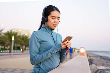 Happy young Asia girl tourist with casual style hold mobile phone relax cheerful take photo peaceful picture of temple in bangkok city at night. Lifestyle tourist travel holiday concept.