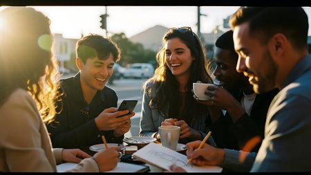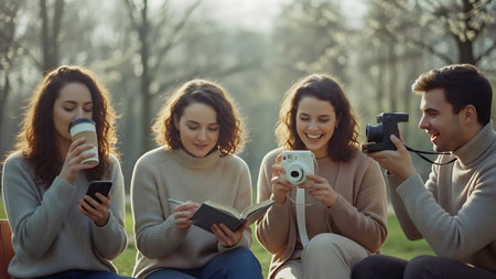 A group of five friends enjoying a sunny day outdoors, laughing and sharing moments, one person taking a photo, others holding cups and a book