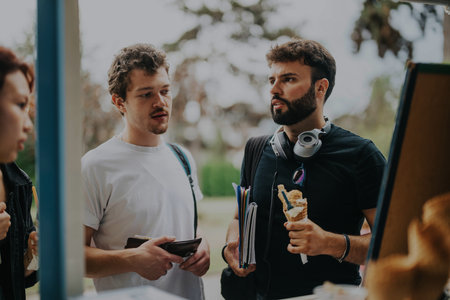 A group of young adults sit and stand together outdoors, enjoying each other's company with books, drinks, and a camera, set against a bright sky.