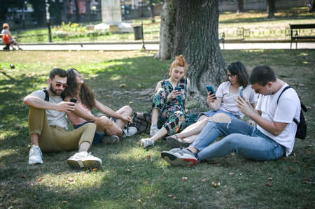 Group of friends using smartphones together. Young people addiction to new technology trends. Youth, new generation internet friendship concept. Emotional isolation and depresion