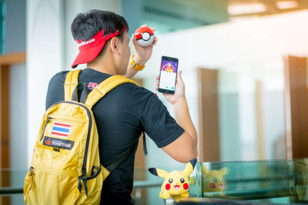 BANGKOK, THAILAND - August 14,2016: Trainer boy playing pokemon , pokemon ball and Pokemon Go gameplay screenshot on the phone ,Lighting with sun flare