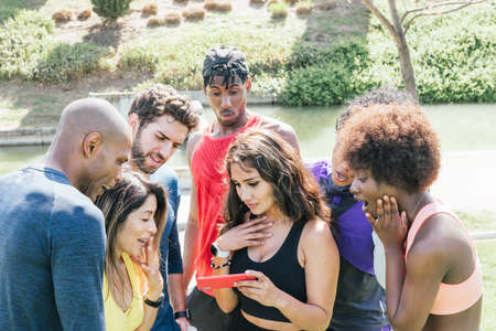 Cheerful young multiethnic group of friends taking photos with camera outdoors