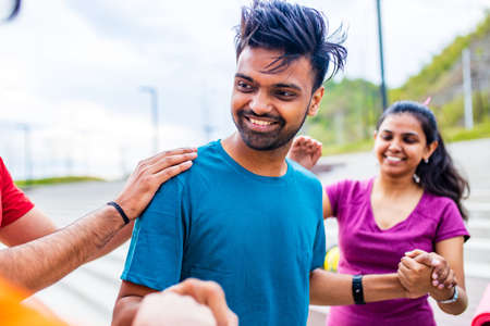 Smiling athletes in a team huddle after a grueling game discussing how they use cryotherapy sessions as a tool for stress management during intense training