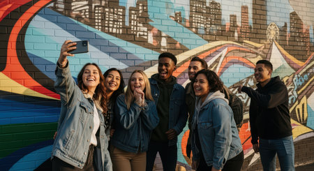 Just for fun Group of cheerful young people bonding to each other and making selfieon camera while having fun on the roof : Generative AI