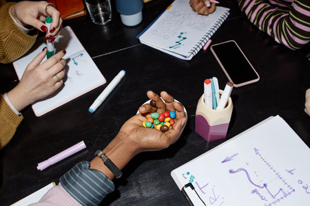 Hand holding colorful candy while sitting at table with young adults drawing graphs and writing notes using markers and notebooks
