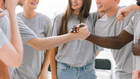 Laughing mature and multiethnic sports people putting hands together at park. Happy group of men and beautiful women smiling and stacking hands outdoor after fitness training. Multiethnic sweaty team cheering after intense training.