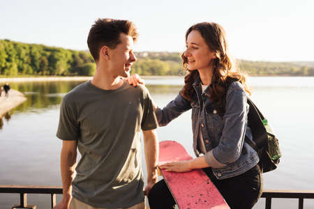 Friendly couple on a date outdoors in the park talking, laughing with skateboards