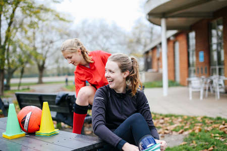 Smiling happy talking mother and daughter teenager, parent and child jogging together, relaxing after exercise drinking water and looking at smartphone