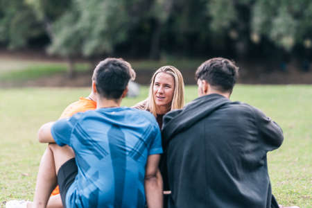 Group of teenagers in a park sitting on the ground. Engaging in a deep conversation while sitting on the grass. Generative AI