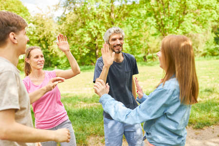 Group of friends enjoying lively time in the park, laughing and playing together on a sunny day in a cheerful, natural setting.
