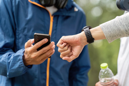 Active Asian young sportsman using a smartwatch or smart fitness band to track his outdoor workout and activities, man reviewing an exercise and health information after finished outdoor workout.