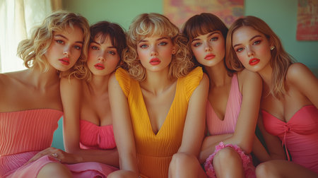 A captivating group portrait of five stylish women in vibrant skirts and heels, seated indoors. The image radiates elegance, fashion, and contemporary beauty.