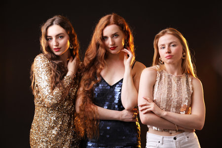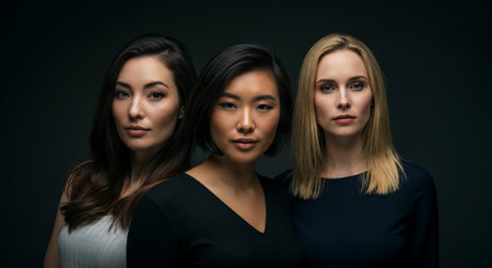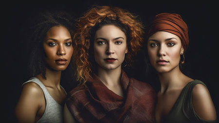 Three empowered women exuding elegance and strength against a minimalist dark backdrop. Ideal for concepts of diversity and style. Generated A.I.