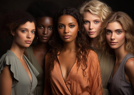 A stunning portrait featuring five women of different ethnicities, each radiating confidence and grace. Their harmonious expressions and stylish outfits create a powerful message of diversity and togetherness, celebrating individuality and shared strength.