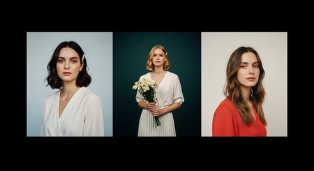 A triptych of three women with different hairstyles and outfits, posing against contrasting dark green and beige backgrounds, showcasing their individuality and style.