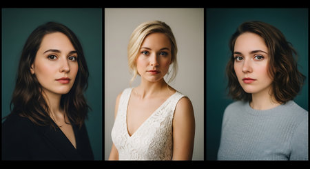 A triptych of portraits featuring three women with brown hair and bangs, each wearing distinct outfits against subtle, gradient-colored backgrounds.