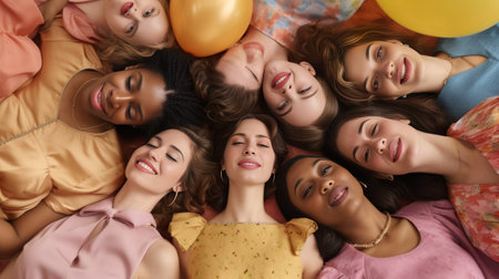 Real beauty in diverse togetherness: Attractive group portrait of multicultural Caucasian, Asian, African American and mixed race female friends celebrating springtime in a studio shot, showcasing their natural beauty, confidence, and femininity, with a fe