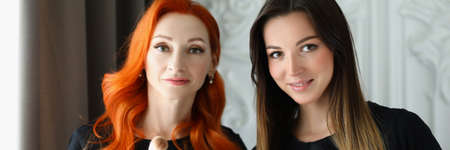 Group of diverse looking business women in a modern office. Businesswomen team in office. Stylish happy office staff. Feminism concept
